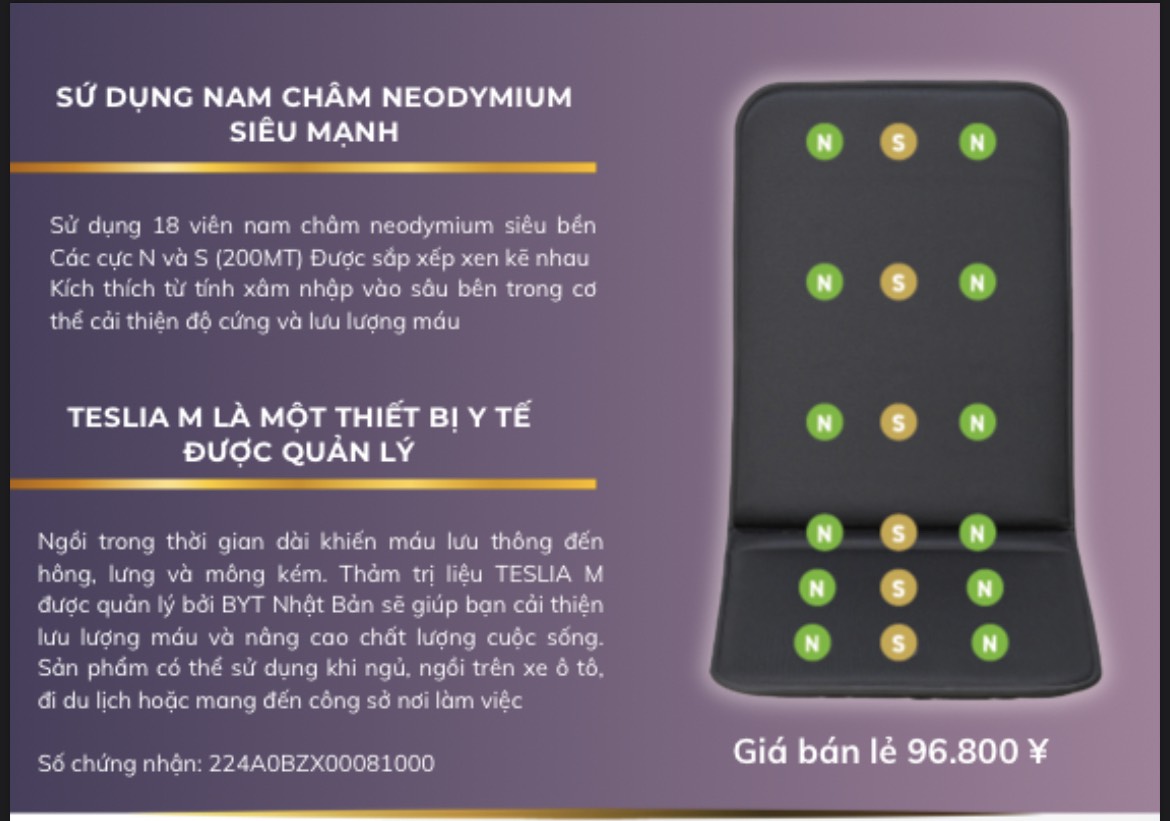 TESLIA M là thiết bị y tế trị liệu sử dụng 18 viên nam châm neodymium siêu mạnh (200MT) được sắp xếp xen kẽ cực N và S. Sản phẩm được nhập khẩu chính hãng bởi Nyoko Việt Nam và quản lý chất lượng theo tiêu chuẩn của Bộ Y tế Nhật Bản.